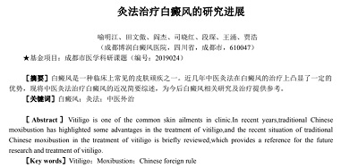 作为现在的白癜风重点专科,我院在白癜风新型技术的研发上也绝不甘落后于国内外任何一家医疗机构,随着我院科研团队对白癜风研究的深入开展,发现中医外治法如火针、穴位埋线、药浴等疗法愈加在白癜风的治疗中发挥重大作用,其总结作简要综述的论文《灸法治疗白癜风的研究进展》也刊登于国家级核心期刊《皮肤病与性病》的2021年第2月底43卷第1期。