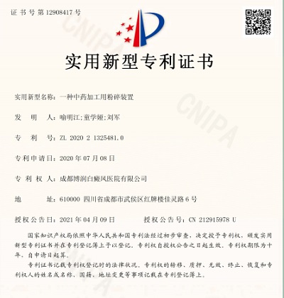 目前,科研进度非常喜人,同时为提高治疗效率,改进药线点灸治疗中的一些弊端,研发出了多种应用于药线点灸中的特殊专利,如一种中药加工用粉碎装置,它通过输送螺杆促进药材进入粉碎腔,不会堆积在进药口,促进加工效率。加工完后,打开风机,还可将粉碎腔内残留的药物吹出,避免药物残留。