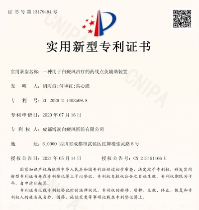 为进一步探究药线点灸治疗白癜风的可能性,于2021年6月25日,我院联合成都中医药大学附属医院、内江市中医院进行了课题《药线点灸治疗稳定期白癜风的多中心随机对照研究的临床研究》的研究,该课题已在四川省中医药管理局科研立项,立项编号为:2020LC0087。并获得四川省中医药管理局科研专项基金支持。