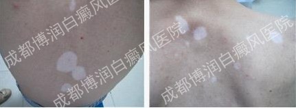 (初诊时,背部白斑呈现块状分布,色素脱失严重,边缘清晰)