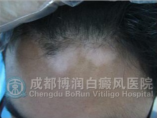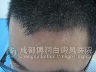 ▲病 史:患者半年前发现额部白斑,在皮炎所治疗,口服药及外用药治疗,效果不明显,今日来我院治疗。