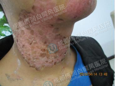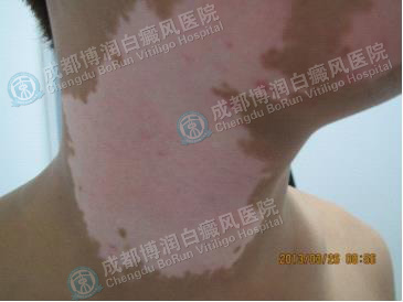 (3月26日初诊时,患者颈部部片状白斑明显,边缘清晰,处于稳定期)