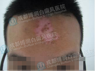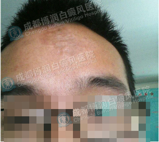 (5月10日初诊时,患者额头白斑明显,边缘模糊,处于进展期)