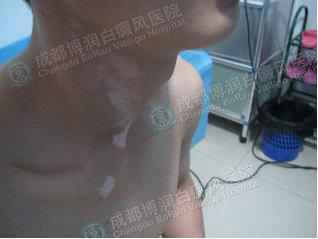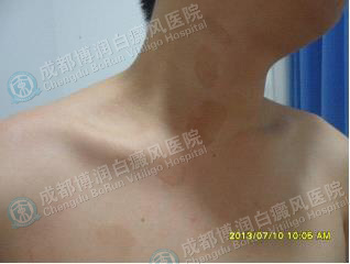(6月3日初诊时,患者颈部块状白斑明显,边缘模糊,处于进展期)