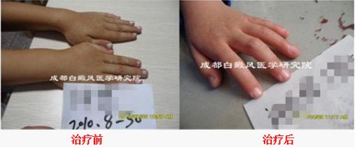 可是过了两星期后,当许某某的手部烫伤基本痊愈的时候,父母发现许某某的手背开始出现了一块一块的白斑,又不像是烫伤后留下的印记。于是,父母又带许某某到院检查,医生告诉许某某父母孩子八成是得了白癜风了,是烫伤引起的同形反应。这下父母可慌了,连忙问医生该怎么治。当时去的是小区附近的诊所,所以医生也不敢乱治,就推荐许某某父母到,那边是专业治疗白癜风的,疗效很好。于是在2010年8月30日,父母带着孩子来到我院就诊。