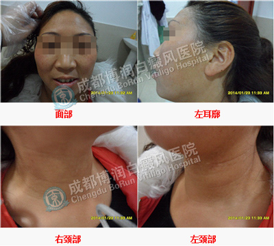 (2014年1月5日,患者来院复查,面颈部白斑已完全消除,与正常肌肤无异;建议患者做好后期日常护理,按时复诊,以确保白癜风的不再复发)