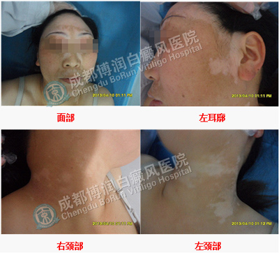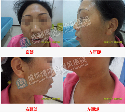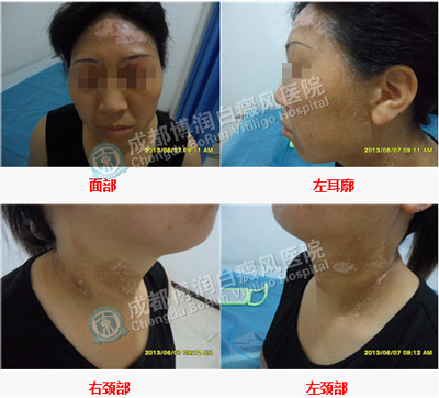 (2013年6月15日初诊时,患者面颈部白斑明显,边缘模糊,处于进展期)