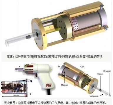 MIT低压无针注射技术以压缩空气为动力,使药剂加速到每秒200至300米的速度,并行成一股极其微小的液体留,迅速穿透皮肤表层,在软组织中扩散。该技术设备整体呈手枪形状,方便手握操作,是一种高负荷无针注射系统。