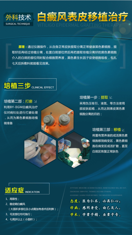 通过仪器操作,从自身正常皮肤提取分离正常健康黑色素细胞,提取好后再经过培植分离,处置白斑部位然后再把提取培植分离好的黑色素细胞介入的白斑的部位同时配合细胞营养液,黑色素生长因子促使细胞吸收,包扎七天后拆敷料就能看见效果。