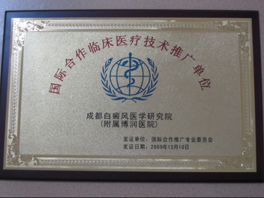 多年来,成都白癜风医学研究院附属医院始终坚持以白癜风医疗的学科优势为依托,在国内外举办各种大中型的白癜风科研交流活动,与包括美国、英国、德国、日本、香港、澳大利亚等国家在内的相关大学、医院、科研机构均建立了长期、稳定的学术交流与医疗合作,每年都会应邀出席国际各大白癜风高峰学术论坛并发表重要科研成果报告。截止目前,我院共派出100余人次的科研人员前往世界各地进行交流、学习,60余人次国外专家学者也受邀来我院访问和工作,被国际合作推广专业委员会授予“国际合作临床医疗技术推广单位”。