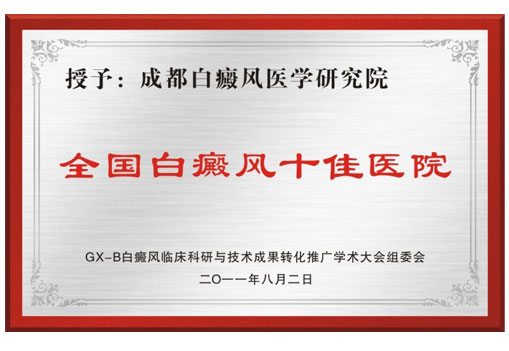 2011年8月2日,由中国中医药学会、中国中医药研究开发协会主办的“GX-B白癜风临床科研与技术成果转化推广学术大会暨全国白癜风康复爱心通道启动仪式”于在北京钓鱼台国宾馆隆重召开。大会综合白癜风科技转化成效、白癜风临床防治情况等标准,评选全国白癜风十佳医院,成都白癜风医学研究院附属医院从30多家医院中脱颖而出,荣膺“全国白癜风十佳医院”称号。