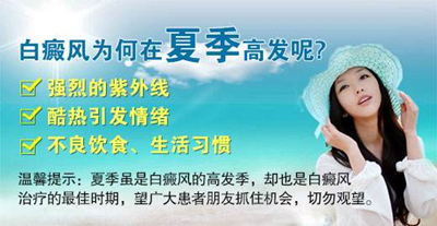 从紫外线上来说:夏季,阳光中的紫外线穿透力开始变的更强,过度的暴晒会使得黑色素细胞大量受损,进而导致黑色素的合成减缓甚至消失,从而诱发白癜风的出现或加重病情。