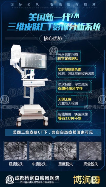 三维皮肤CT利用光学巨变原理,采用计算机三维立体断层成像技术,不仅可以分辨病症是否为白癜风,而且还可以细微的分析皮损状况和黑色素细胞脱失程度等。三维皮肤CT成像检测系统对各种类型的白癜风患者可直接扫描出白斑皮下黑色素细胞的数量或黑色素细胞是否存在,为确诊白癜风提供了可靠依据。