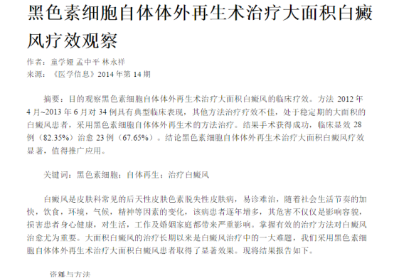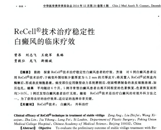 之后在2012-2013期间,通过对34例具有典型临床表现,其他疗法效果不佳,处于稳定期的大面积白癜风患者,采用“ReCell细胞再生术”治疗,手术非常成功,临床显效28例,治愈23例。该结论显示“ReCell细胞再生术”治疗大面积白斑疗效明显,并发布论文。