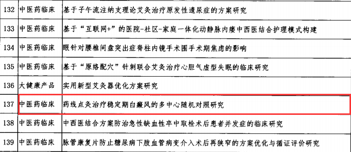 2020年12月15日,四川省中医管理 局公示了“2020年度中医药专项课题立项”名单,全省共403项课题予以立项,成都博润白癜风医院联合成都中医药大学附属医院申报的课题《药线点灸治疗稳定期白癜风的多中心随机对照研究》,经过审核,成功立项。