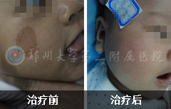 当天,轩轩接受了治疗,妈妈看到轩轩脸上的褐色胎记明显变浅了。