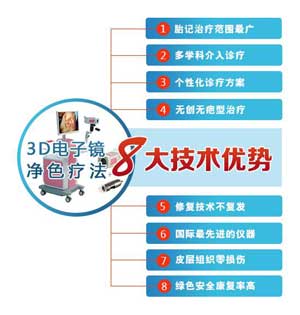 囊扩了国内主流的四大权威疗法,结合中医治疗的深厚理念,能够有效治愈各种类型的胎记、斑痣,大量临床实验验证了色素细胞治疗、电子镜可视化及中西医结合分型诊疗体系的实用性,是国内首家、也是目前为止国内独家3D电子镜融合色素细胞精细化靶向胎记分型诊疗体系。