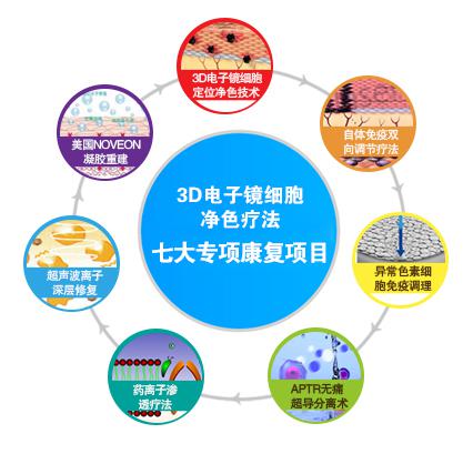 3D电子镜细胞净色疗法利用中西技术有机结合,根据患者不同皮肤情况,通过超声波离子导入技术,将肌肤修复营养液渗透到受损皮层能有效淡化黑色素,促进 皮下微循环,激发细胞再生活力,修复表皮细胞生长因子,重建肌肤屏障功能,达到抚平肌肤,淡化色素,改善肤质的目的,将皮肤调理至健康状态,达到净白护肤 功效。