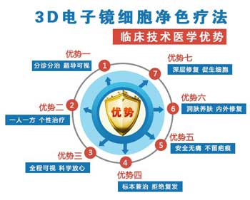 3D电子镜细胞净色疗法祛除表层现象色素异常外,同时根本上调理机体,彻底解决色沉问题,内外双重治疗胎记,解决了胎记治疗久治不愈、反反复复的局面。