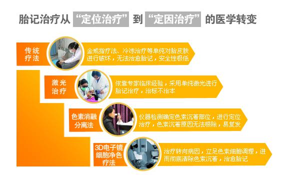 传统激光扫描、生物波、色素消融术等疗法均处于“摸瞎式”,针对表面胎记色素可以精准定位,对于皮下深层胎记色素治疗时由于看不见,所以没办法进行精 准 定位治疗,只能依靠胎记专家临床经验进行治疗,胎记治疗停留在了“表面功夫”传统临床对于色素型胎记的治疗,多采取中药、冷冻、同位素等手段,但只能 去除 表皮层色素,而无法清除深藏在真皮深层的顽固黑素。如何粉碎被“锁”在真皮深层的顽固黑素细胞,是成功祛除色素型胎记的关键所在。国内外皮肤病专家 们也一 直从未止步的研究,探寻最好的方法,3D电子镜细胞净色疗法应时而生。