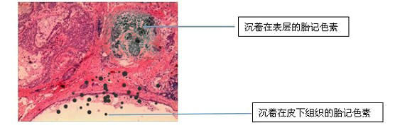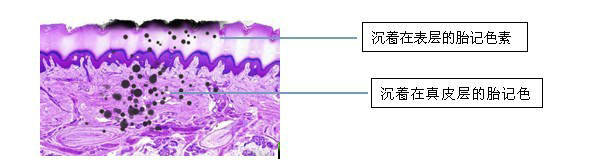 皮肤分为表皮,真皮,皮下组织,一般的胎记会在表层以及真皮浅层,医学资料显示:色素型胎记的发生,通常是由于胚胎发育时,黑素细胞从神经嵴向表皮移 行 的过程中,部分黑素细胞中途掉队,被“锁”在了真皮层,黑素细胞在真皮层不断分泌黑色素,通过神经细胞网传导至表皮,积聚形成色素型胎记。而且随着时 间的 推移,色素会慢慢向皮组织深入蔓延。