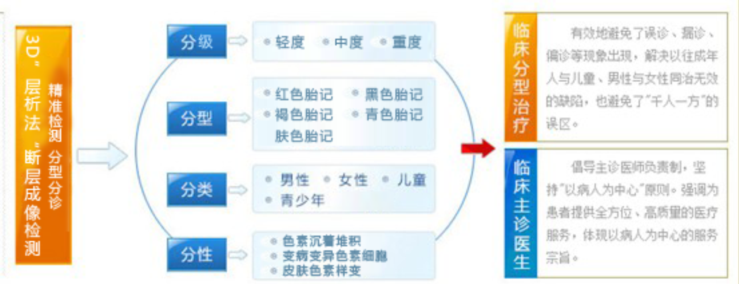 率先在胎记诊疗领域中形成分型分诊治疗架构与理念,针对不同胎记类型,根据不同个体的身体、年龄、病情等差异,通过专家的诊疗排查找出致病因素,专科专治,实施科学规范的个性化、立体化诊疗方案。